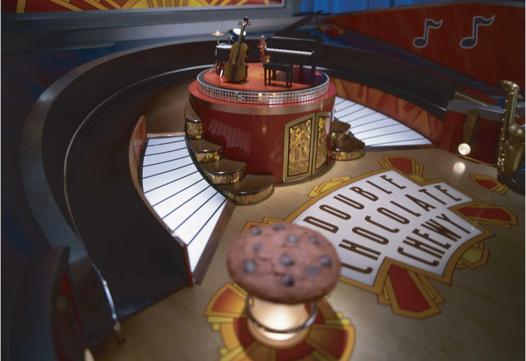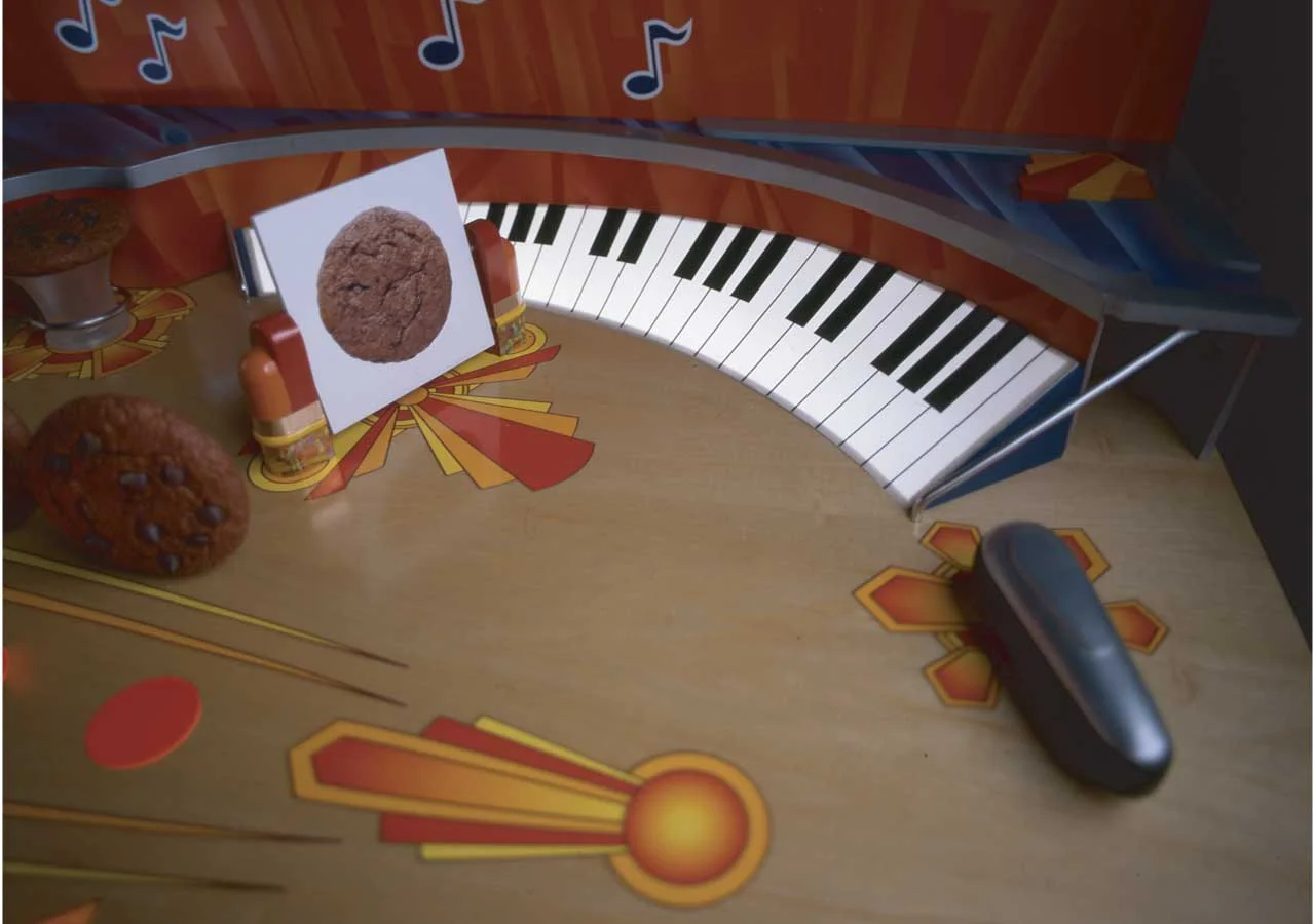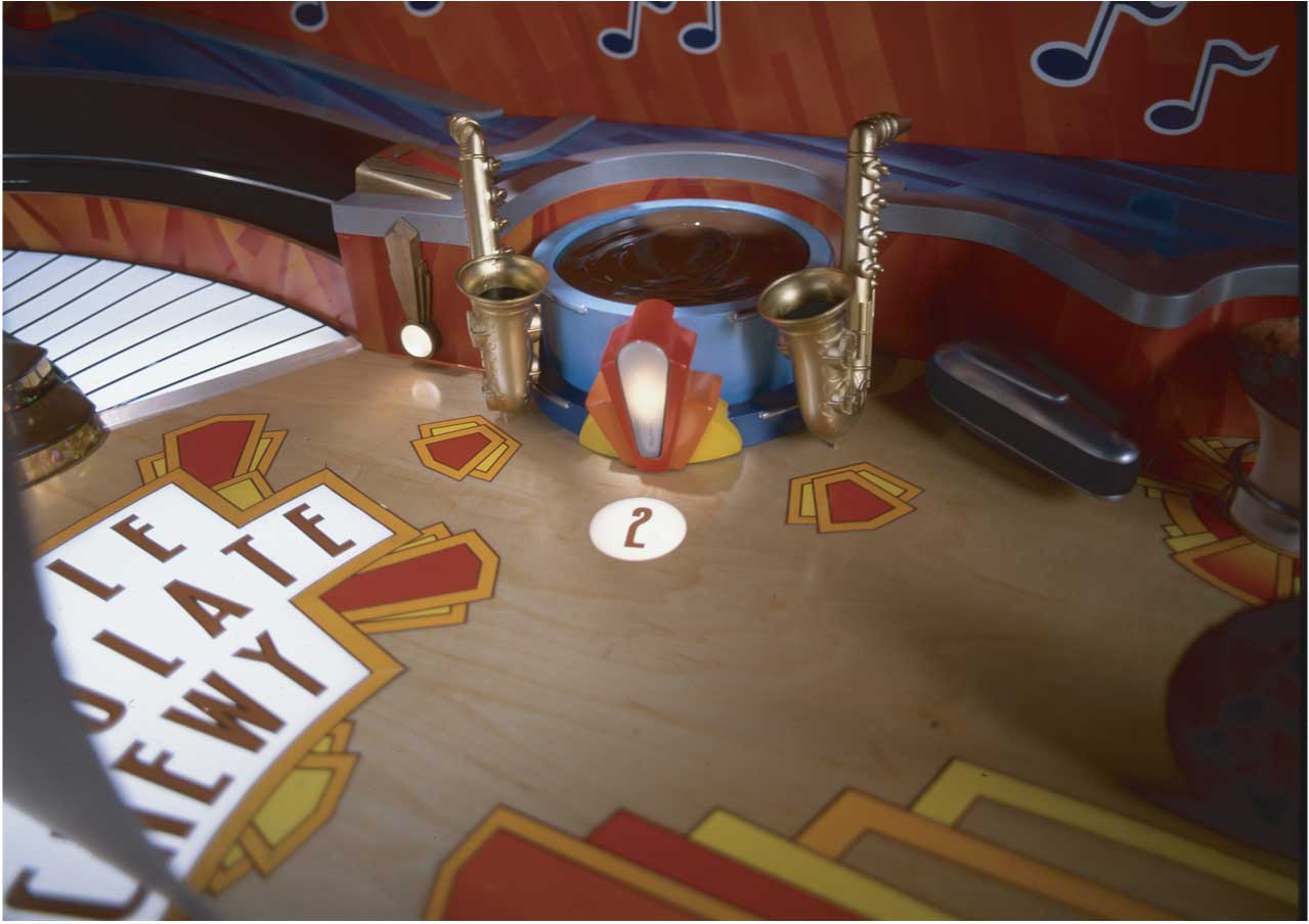 (1-5) Details of the Double Sized pinball machine. A Double sized mixture was necessary to incorporate the more than a dozen motion control stepper motors required to make the repetitive moves coordinated with the CGI characters. I was required to do the graphic design as well as the physical design of the machine and the path of the characters.
