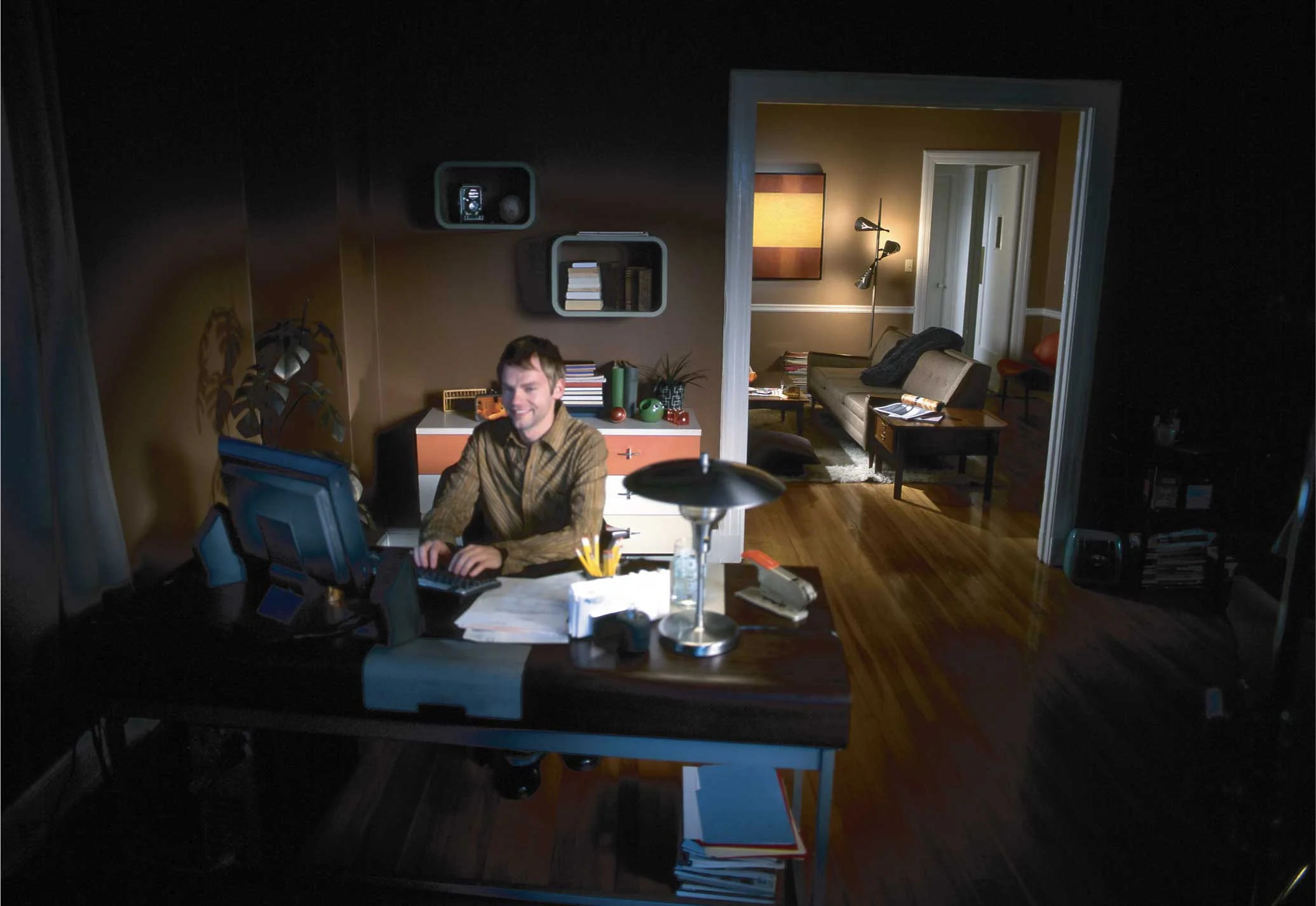 to fall off a bit, and not be too cluttered... Scott and I talked about the character being less metrosexual, and more just a guy with good taste, so the apartment has mostly vintage pieces, and some collectable items.