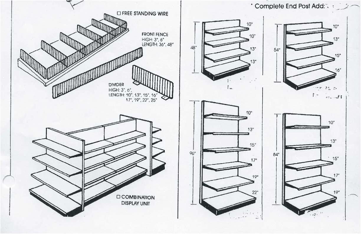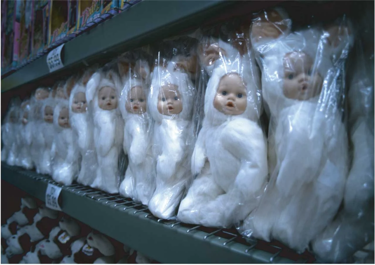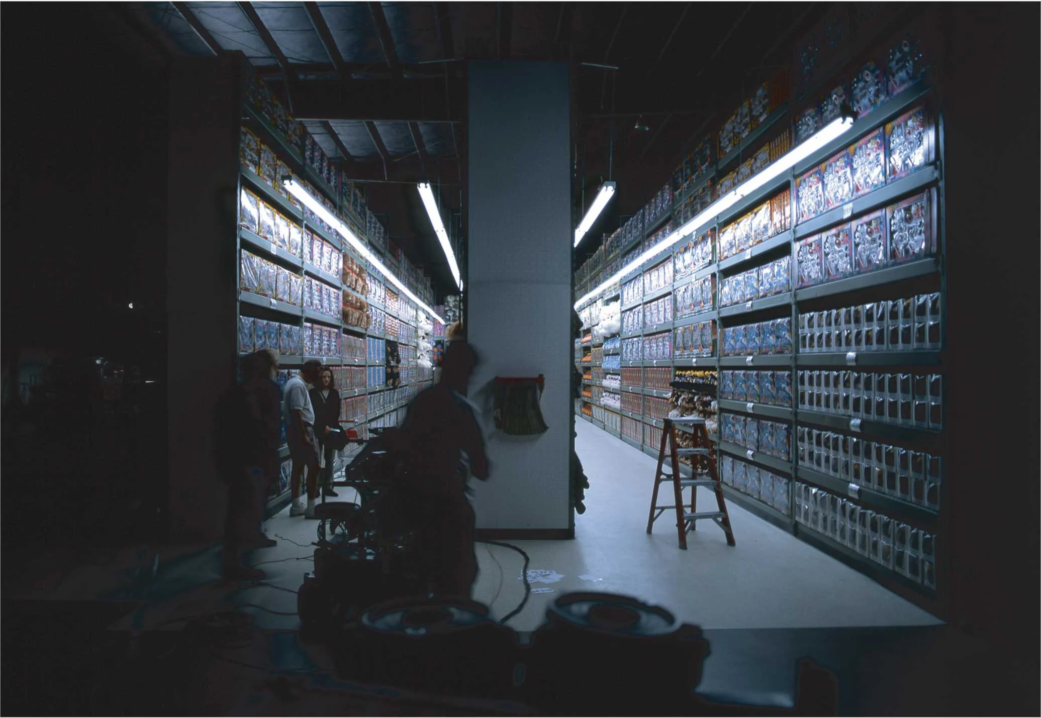 (1,5) Wide shots show the graphic, bland aisles in the cathode ray flicker of fluorescents.