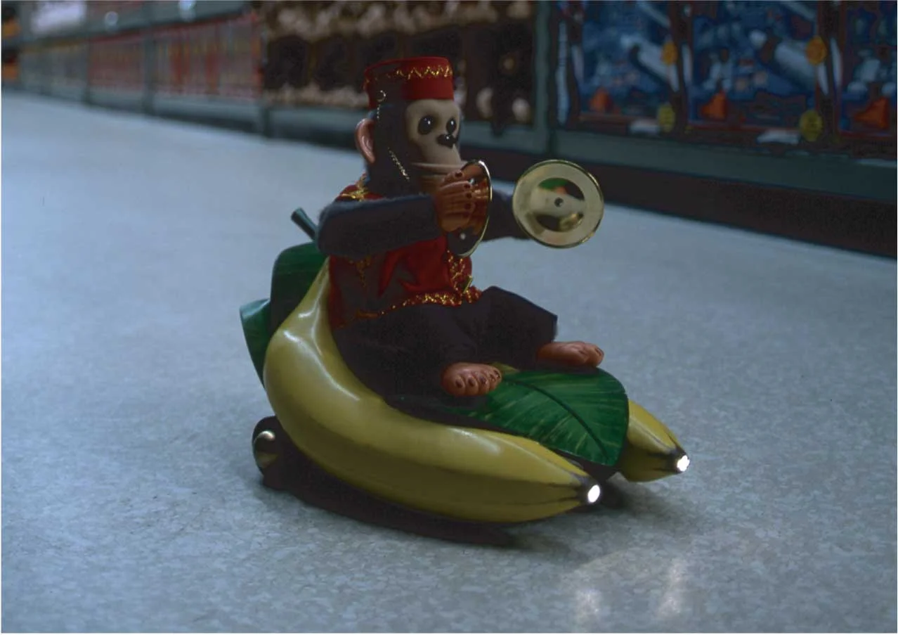 (2-4) Details were the most fun, from the “Mr. Talky, Funky Monkey” toy - a radio controlled, symbol clapping simian toy of my own design and the object of our heroine’s search - to the bizarre bunny children, to the beautiful dolls, perfectly packaged. All the toys and ‘goods’ you see here (we had 3 aisles and 1 back wall full of stuff), we had to beg, rent, buy and borrow - then return (or donate). Overall, a very expensive proposition, but executed in a very thrifty manner - it all cost only about... I’ll tell you when we meet.