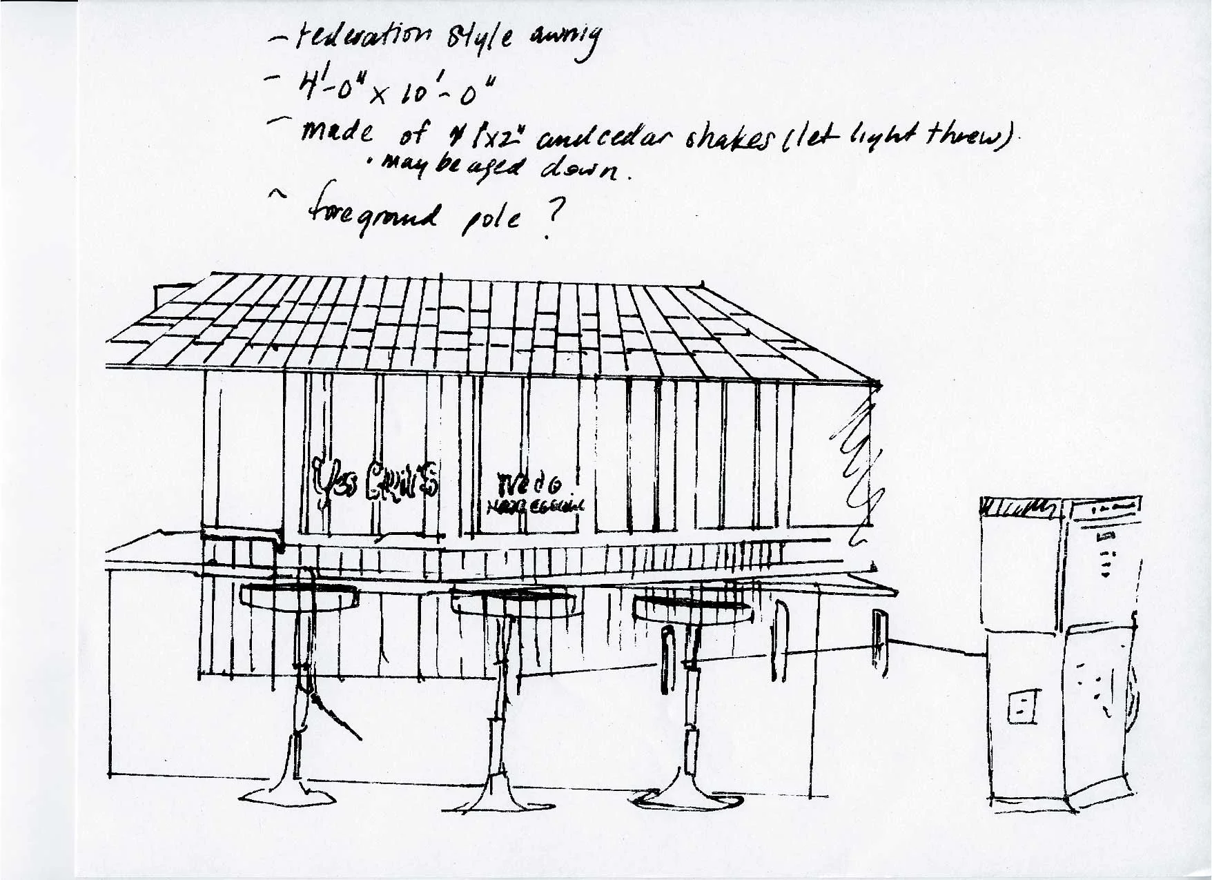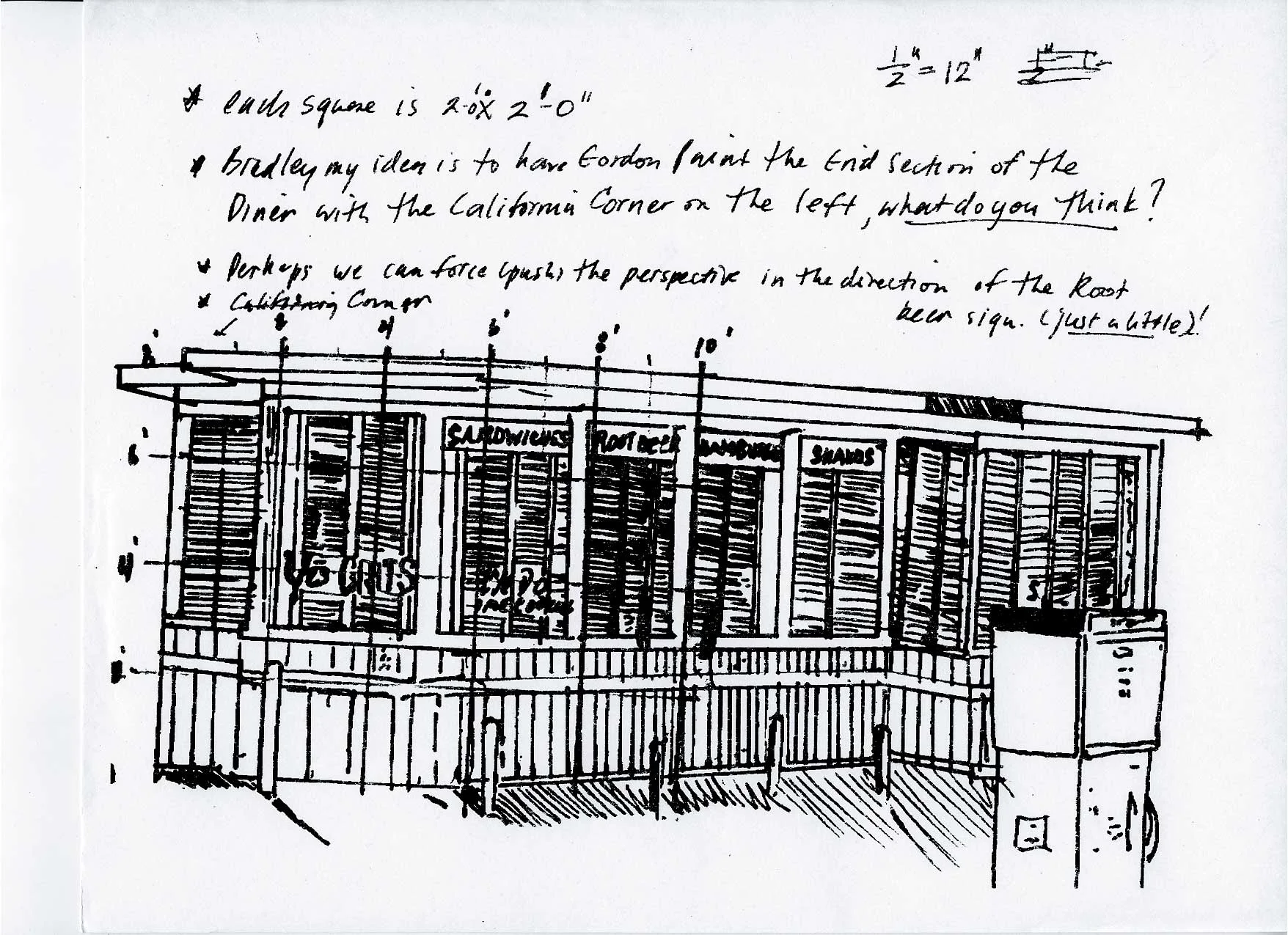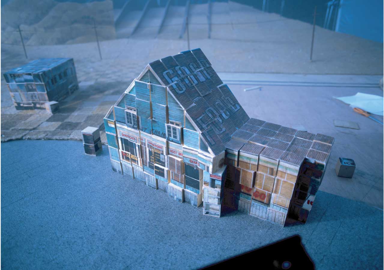 (1) The road house miniature element on the route set. The life size element (4), was built on location and was designed to fit onto the front of the miniature.