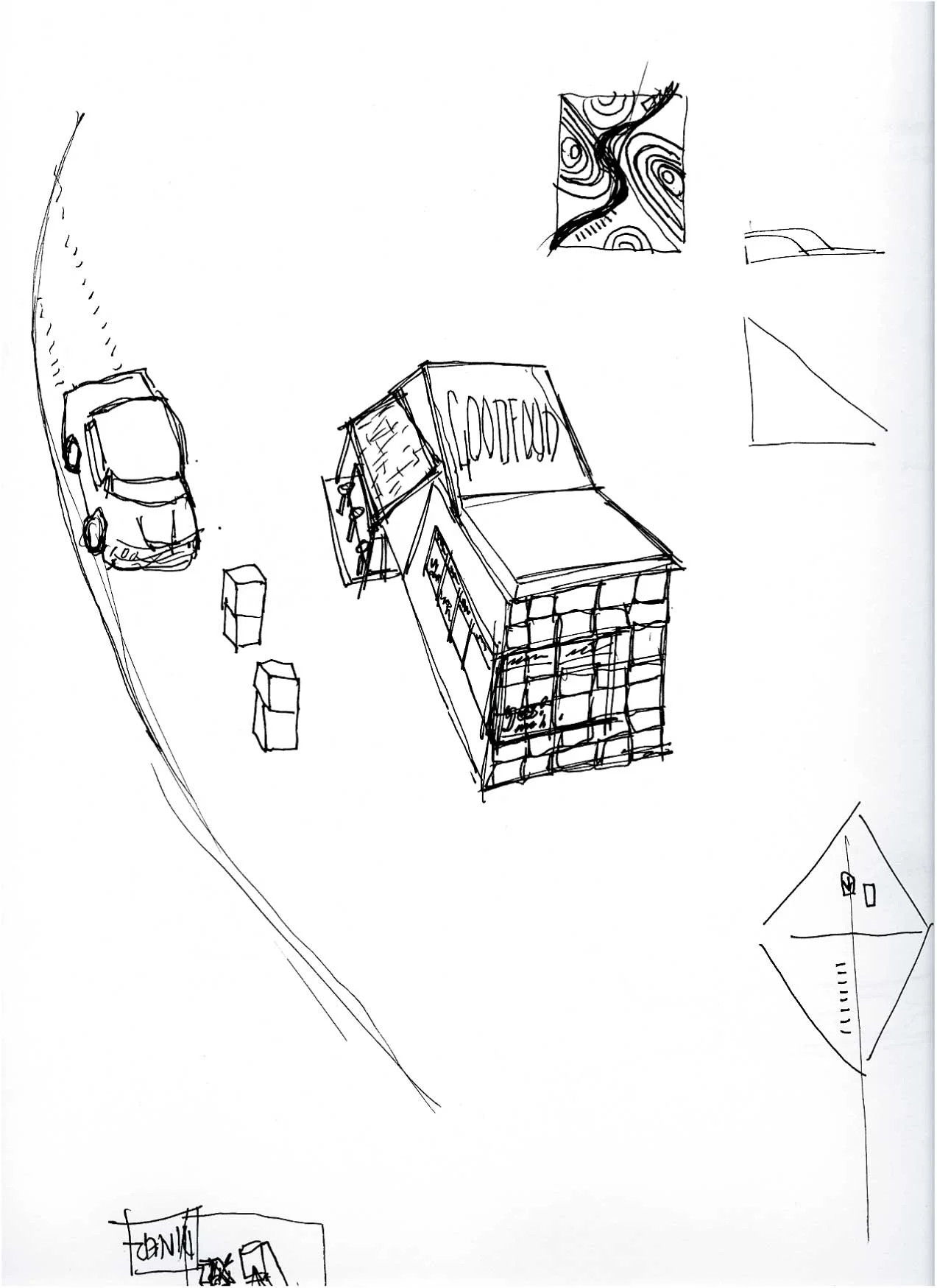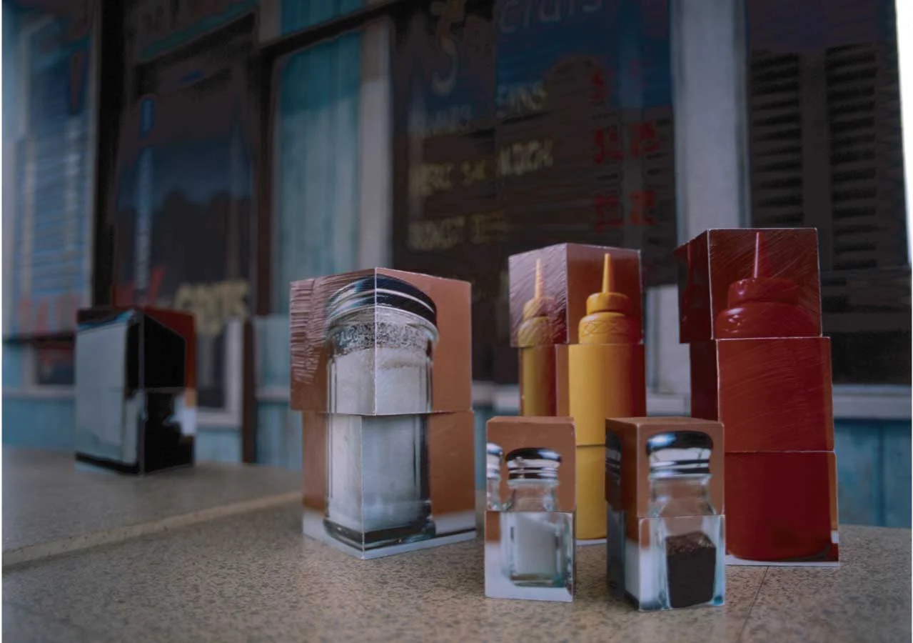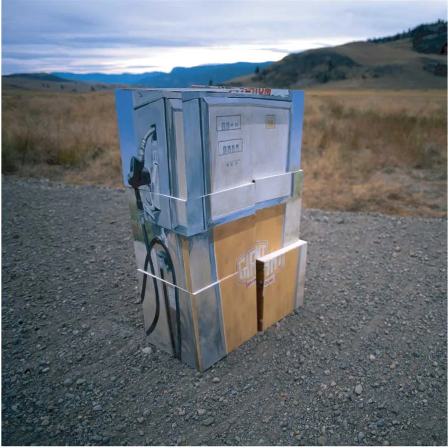 (5,6) Details of the live action full scale interactive element. The countertop props (5), and the petrol pump located near the car (6). The former were photographs applied to blocks, while the latter were painted “trompe l’oeil” from photographs (the abstract nature of the images, lent themselves toward an easier read).
