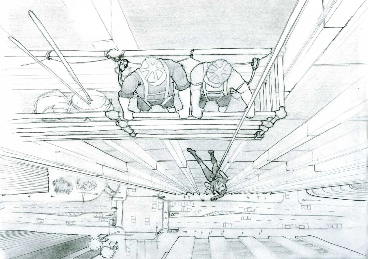 (5) My illustration of our CGI comp shot looking down building.