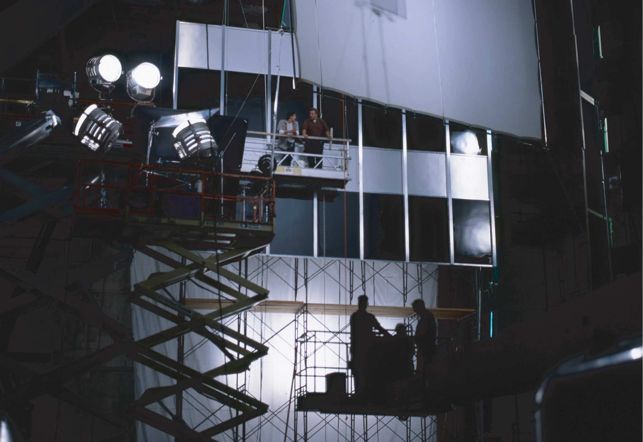 (3) Insert set for skyscraper to allow filming safely on the ground. Translight reflected in glass.