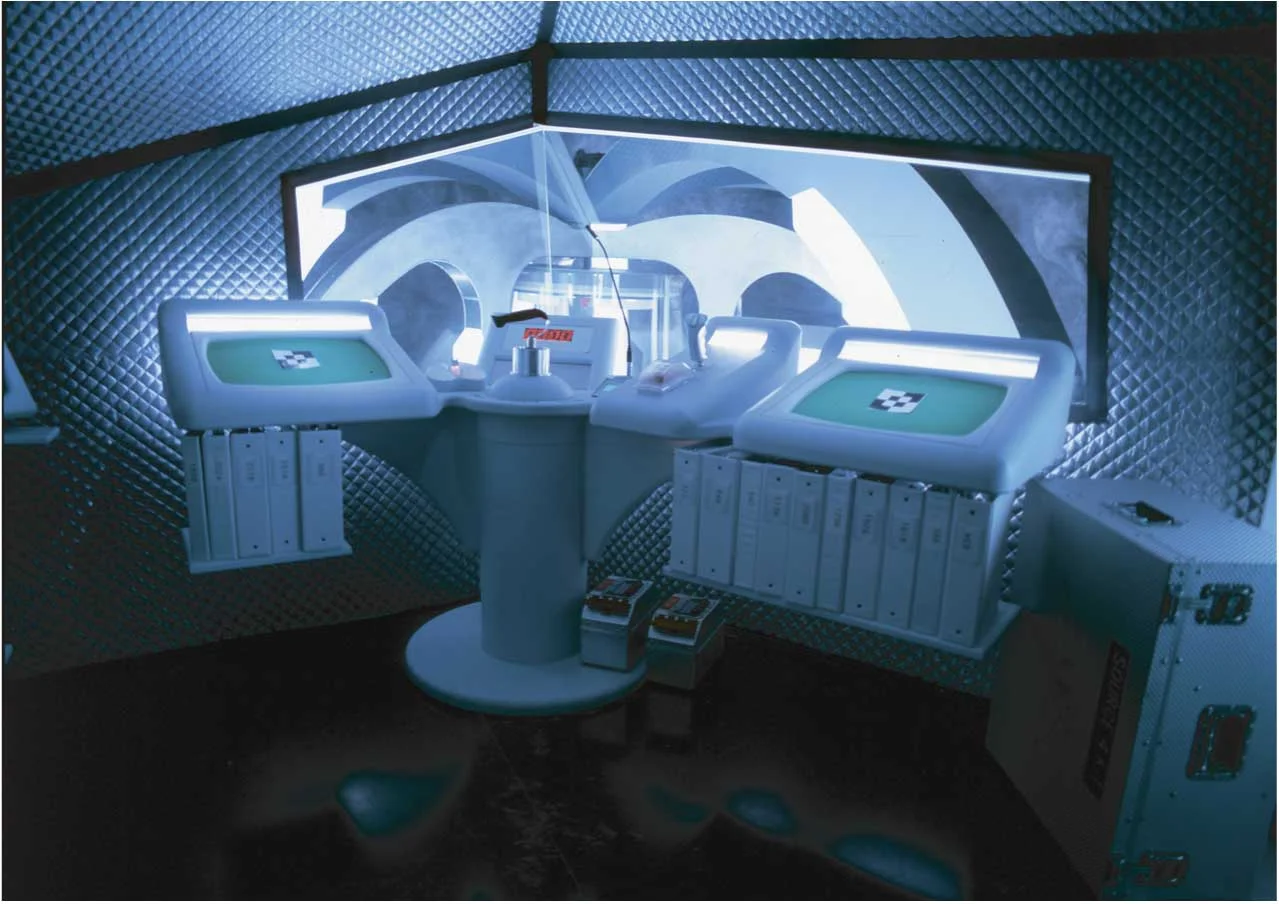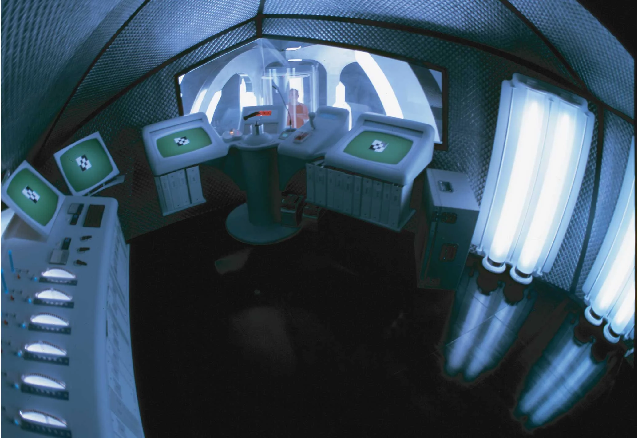(2) The control room that looked down upon the subject and apparatus. Due to a ridiculously low budget, I elected to go with a Japanese Anime look for the instrumentation - and the set in general.