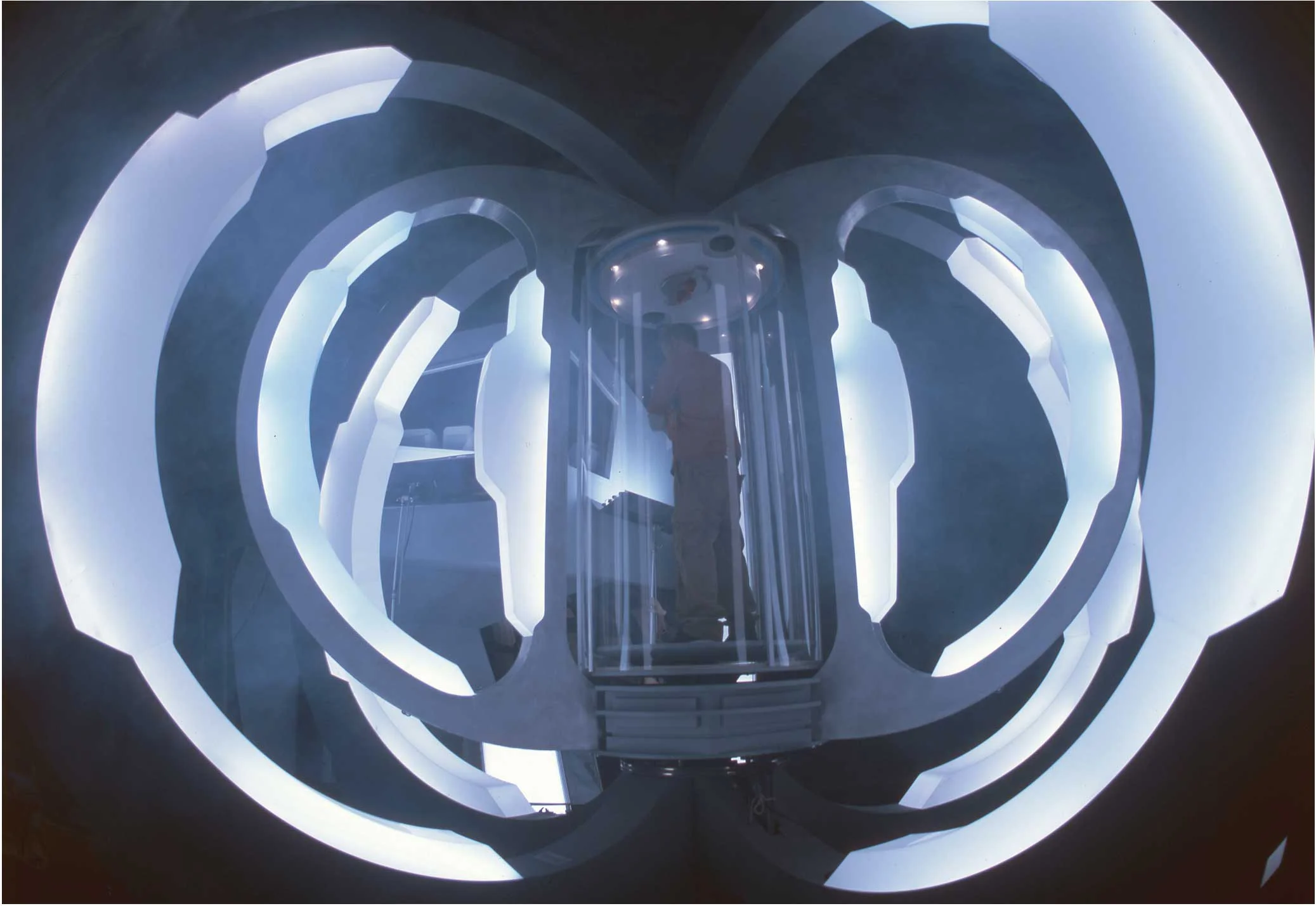 (7) The tunnel which lead from the control room entrance to the apperatus. VERY CHEAP 1/4” MDF and fibreglass sheet, backlit by Matty Labatique to become something very special.