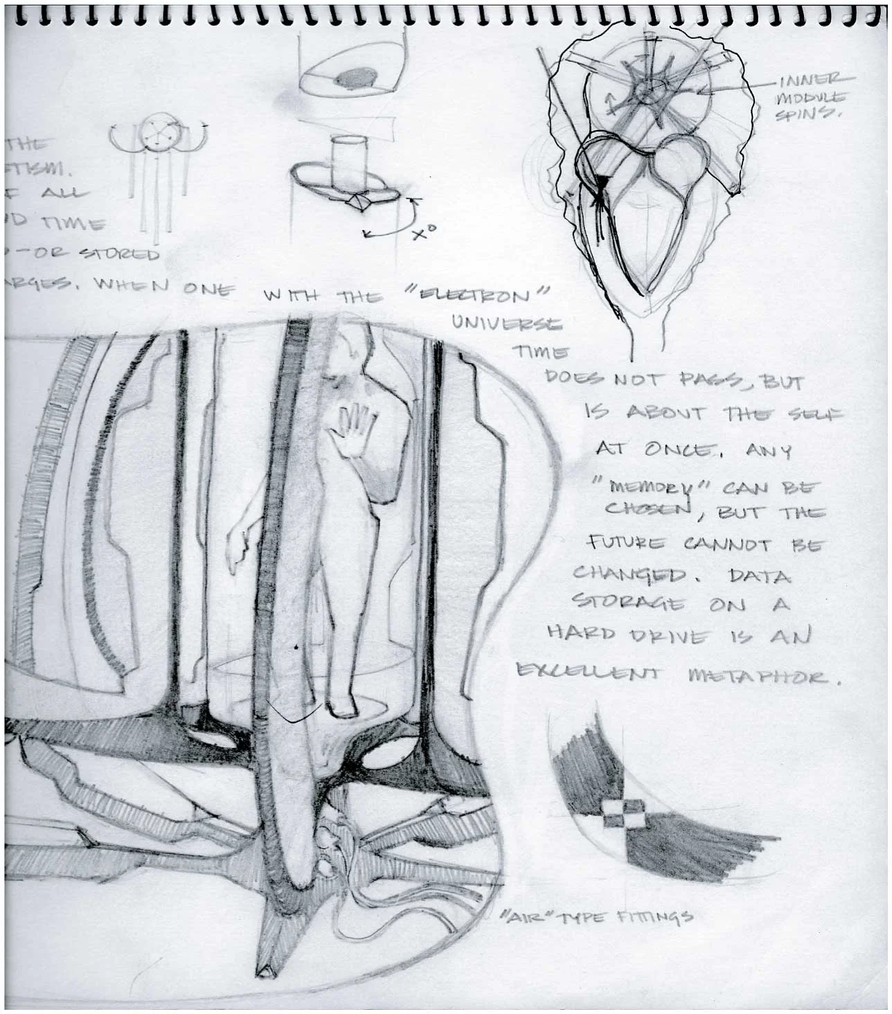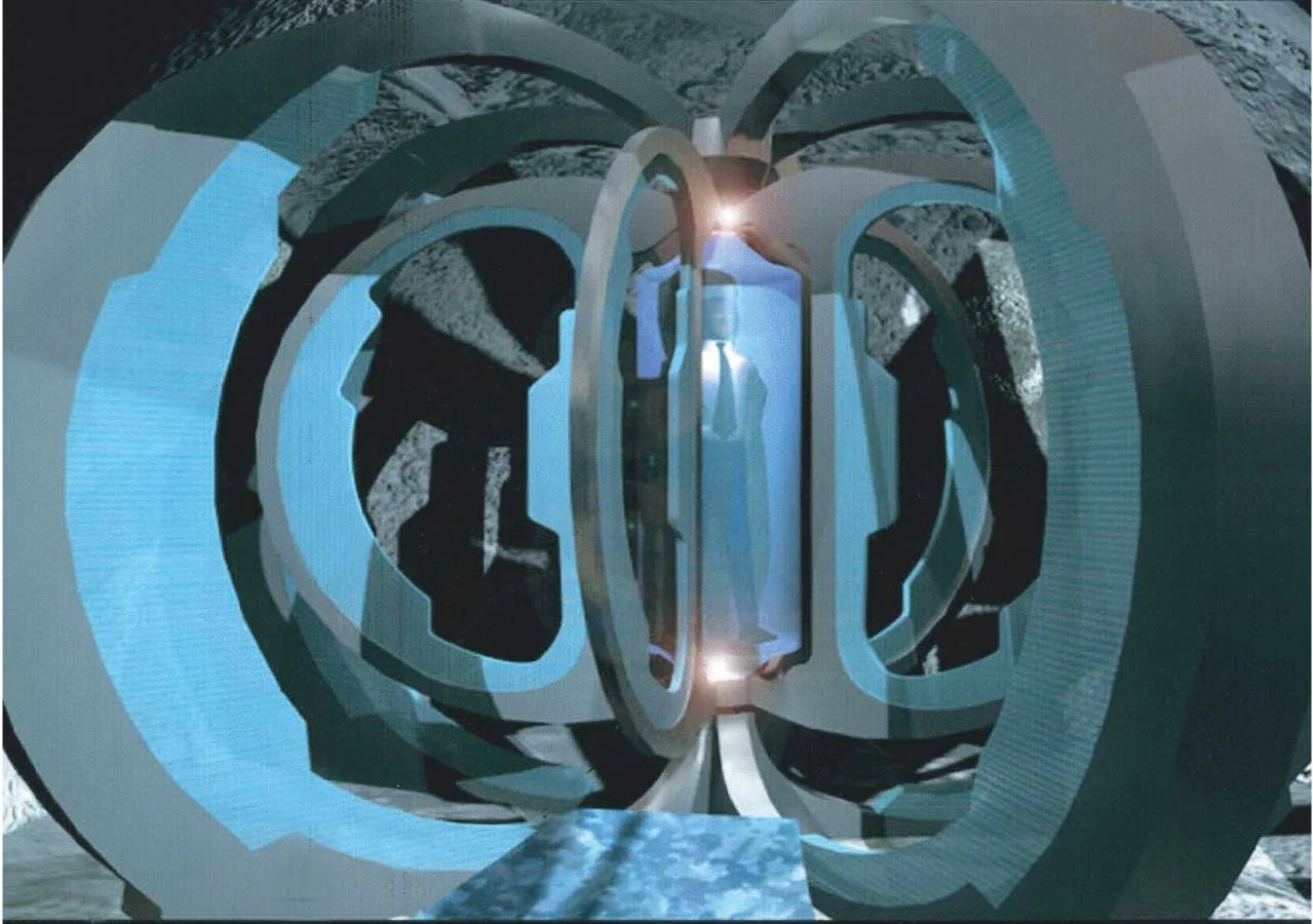 (1) This actually involved designing a time machine principle for the apperatus... The subject would stand in the glass cylinder while the operator would turn on the cyclonic generator (inner set of electron extractor rings), which would then begin dismantling the molecular structure of the subject lifeform into neutrons, protons and electrons, the particles that make up every atom in the universe. The inner extractor rings would then propel the subject’s atomic particles - the positive and negative charged electrons specifically - into the outer receptacle rings. These rings were engineered and assembled in such an integral way with the surrounding highly magnetic iron ore underground location - a top secret, very deep vein of super ionically charged magnetic ferrite ore - that the subject would be able to cogniscently perceive any moment in time, without interaction - the physics relied upon chaos, not control - past or future, and store the memory in much the same manner which memories are stored in our electromagnetic nervous system as we know it. Then, with a simple twist of the switch, back at control, the sub-atomic particles that once made up our subject, are reassembled as if nothing happened, except, the memory of the journey would remain. Fancy. The structure was CAD engineered and rested (spun) on a 50,000 pound swage bearing with electrical commutators to allow the kino flows to have constant power.
